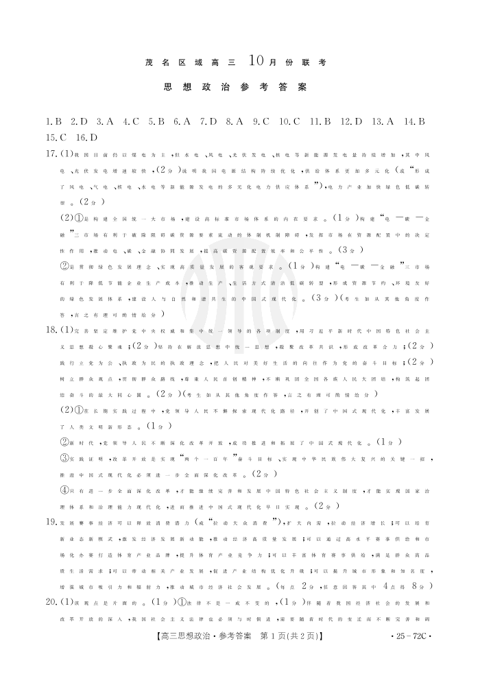 广东省茂名市2025届高三10月联考 政治答案