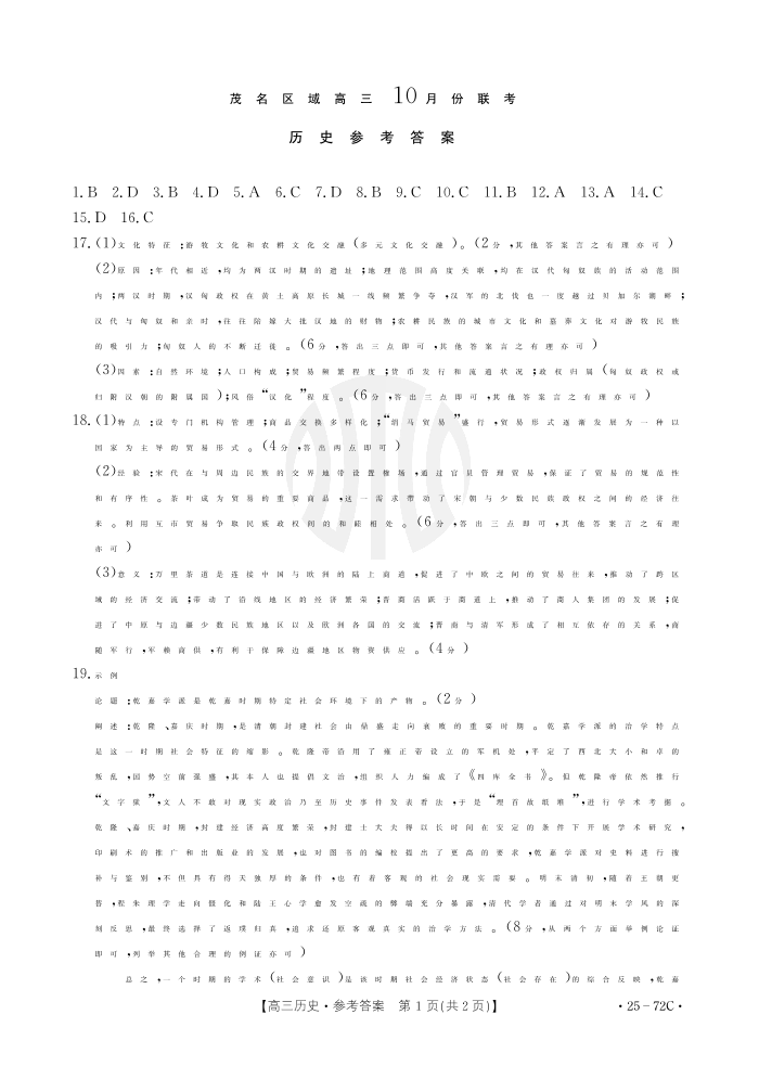 广东省茂名市2025届高三10月联考 历史答案