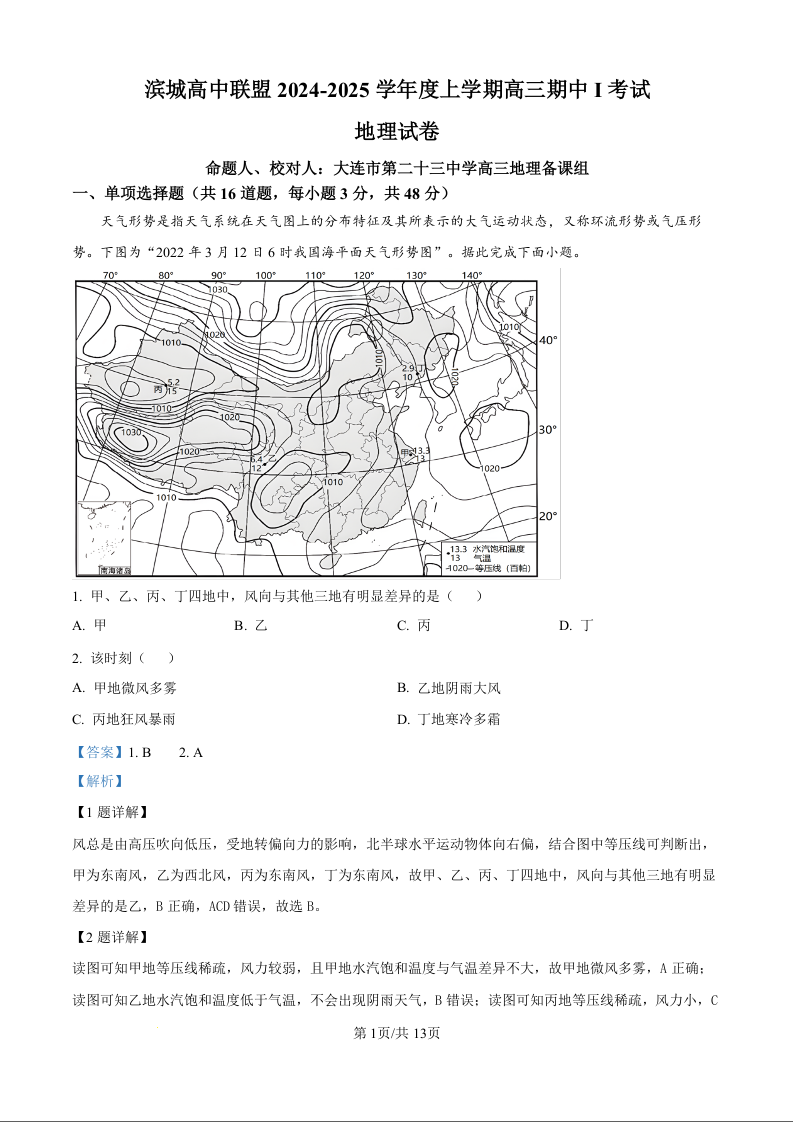 滨城高中联盟2024-2025学年度上学期高三期中考试(一) 地理答案