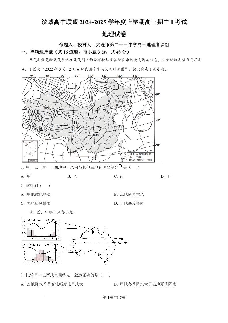 滨城高中联盟2024-2025学年度上学期高三期中考试(一) 地理
