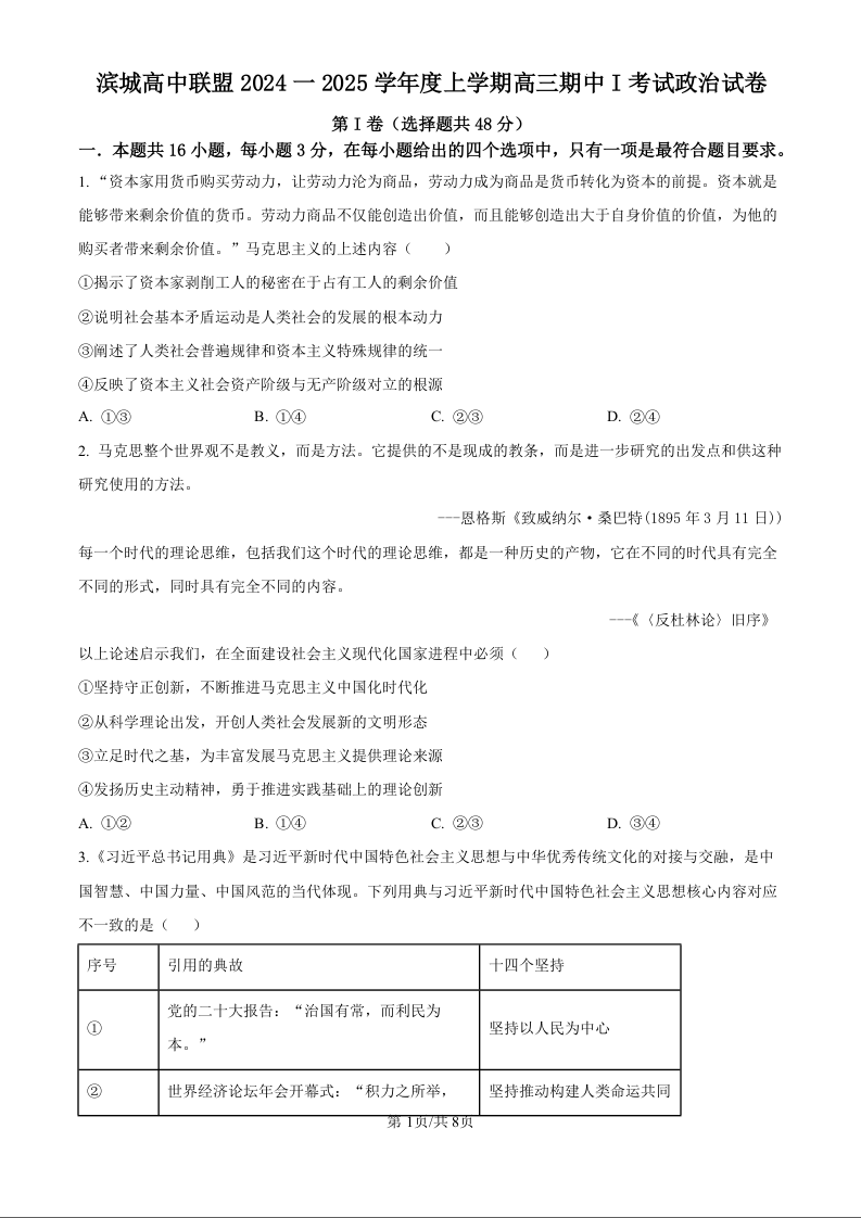 滨城高中联盟2024-2025学年度上学期高三期中考试(一) 政治