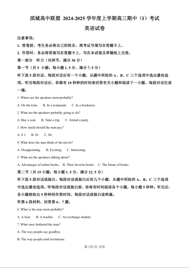 滨城高中联盟2024-2025学年度上学期高三期中考试(一) 英语