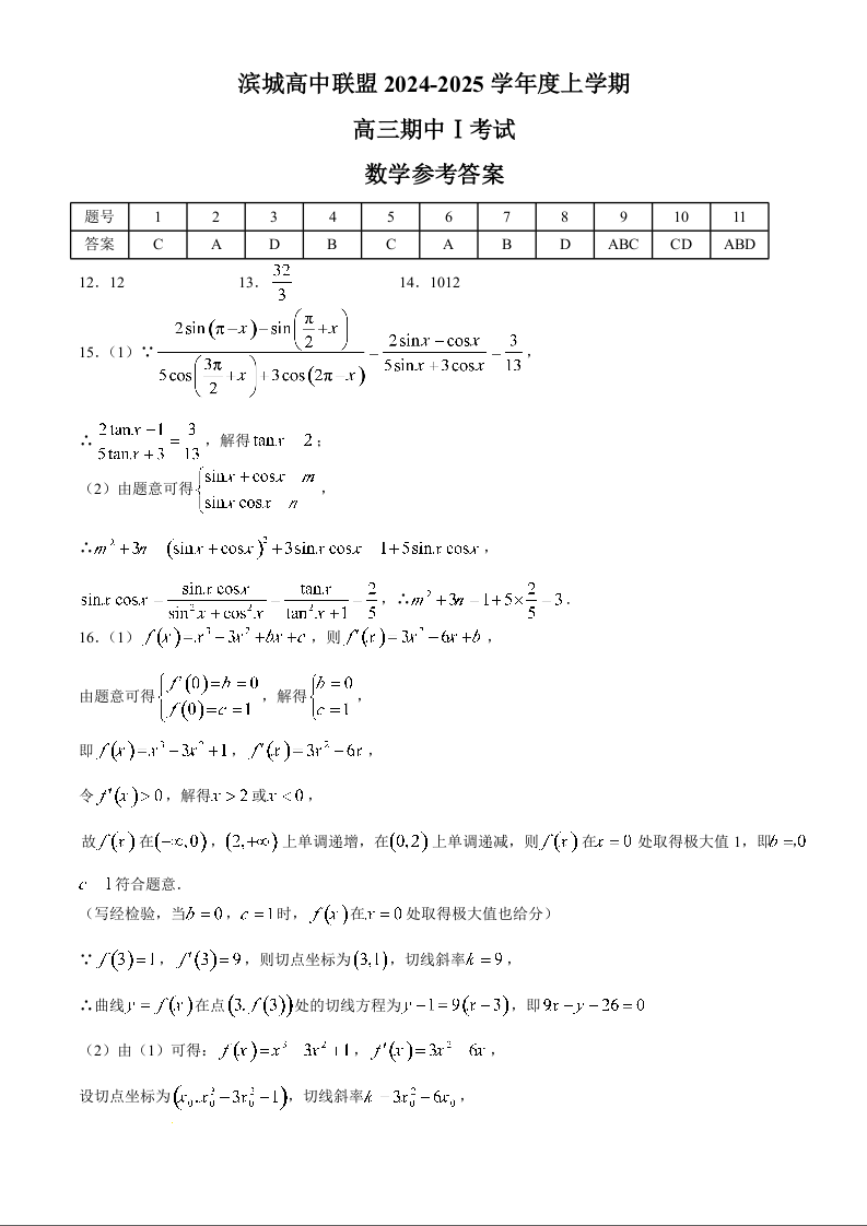 滨城高中联盟2024-2025学年度上学期高三期中考试(一) 数学答案