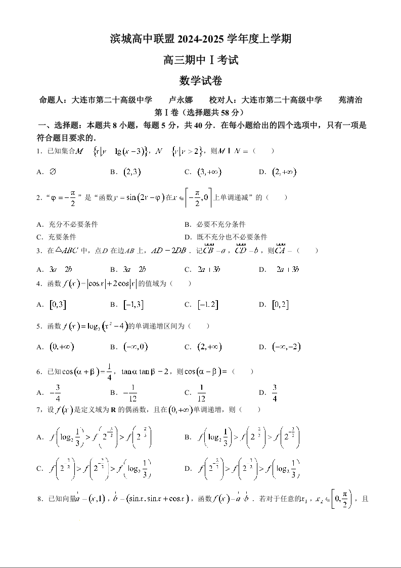 滨城高中联盟2024-2025学年度上学期高三期中考试(一) 数学