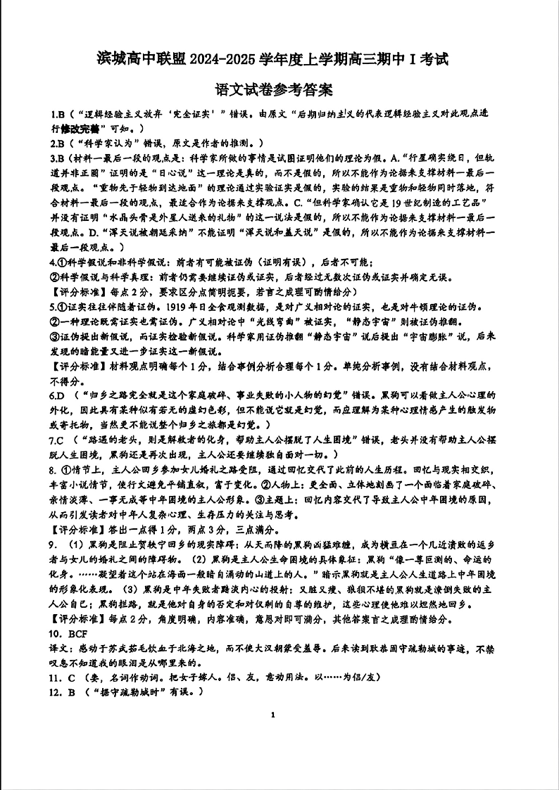 滨城高中联盟2024-2025学年度上学期高三期中考试(一) 语文答案