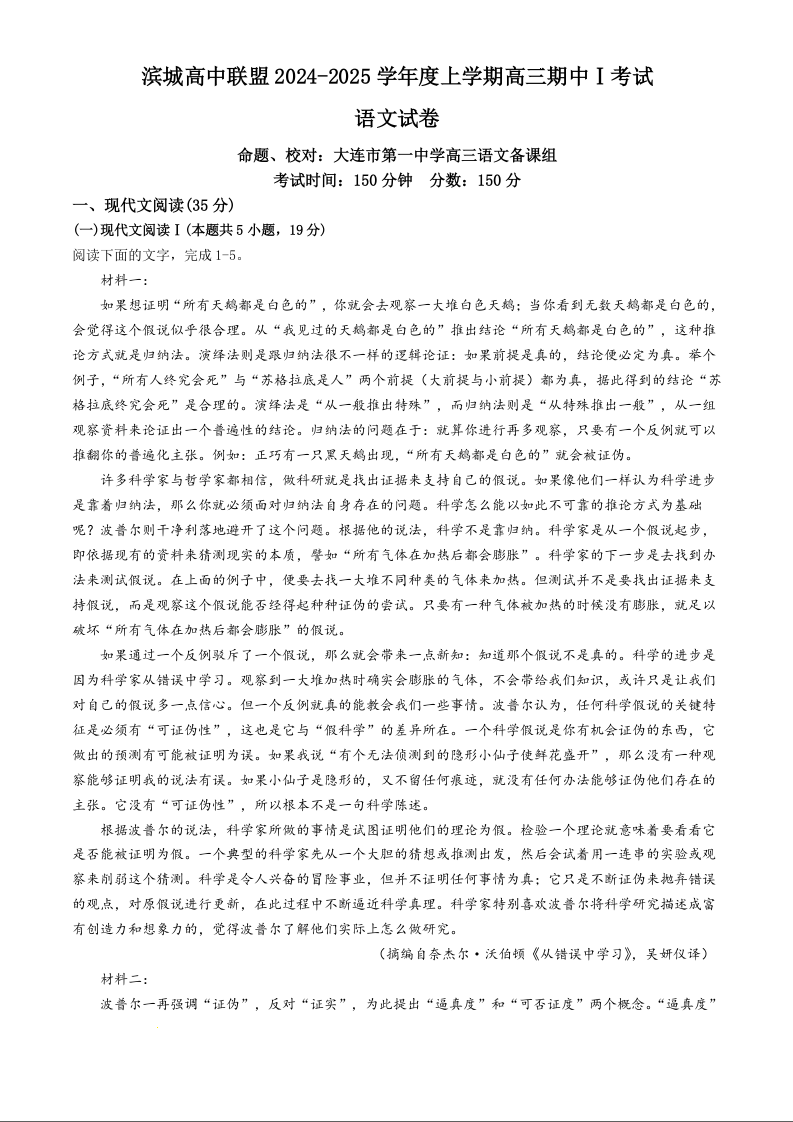 滨城高中联盟2024-2025学年度上学期高三期中考试(一) 语文