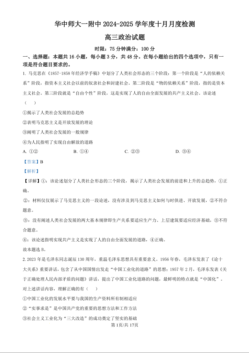 华中师大一附中2024-2025学年度十月月度检测 政治答案