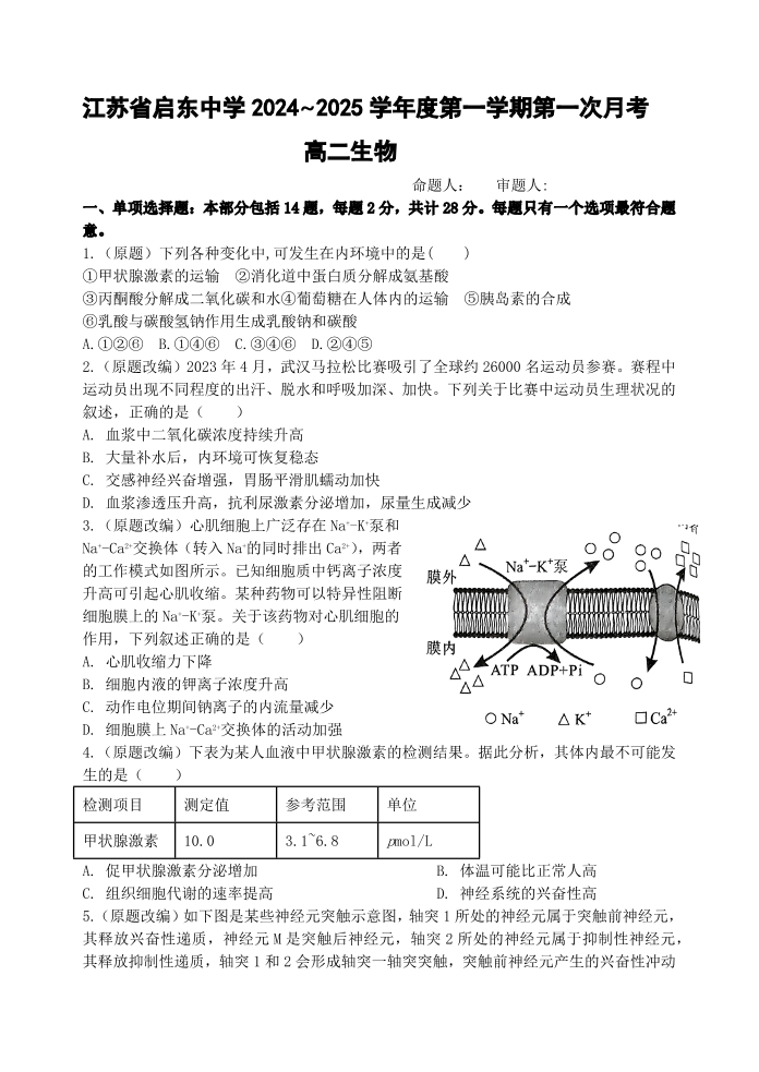江苏省启东中学2024-2025学年高二上学期第一次月考试题 生物