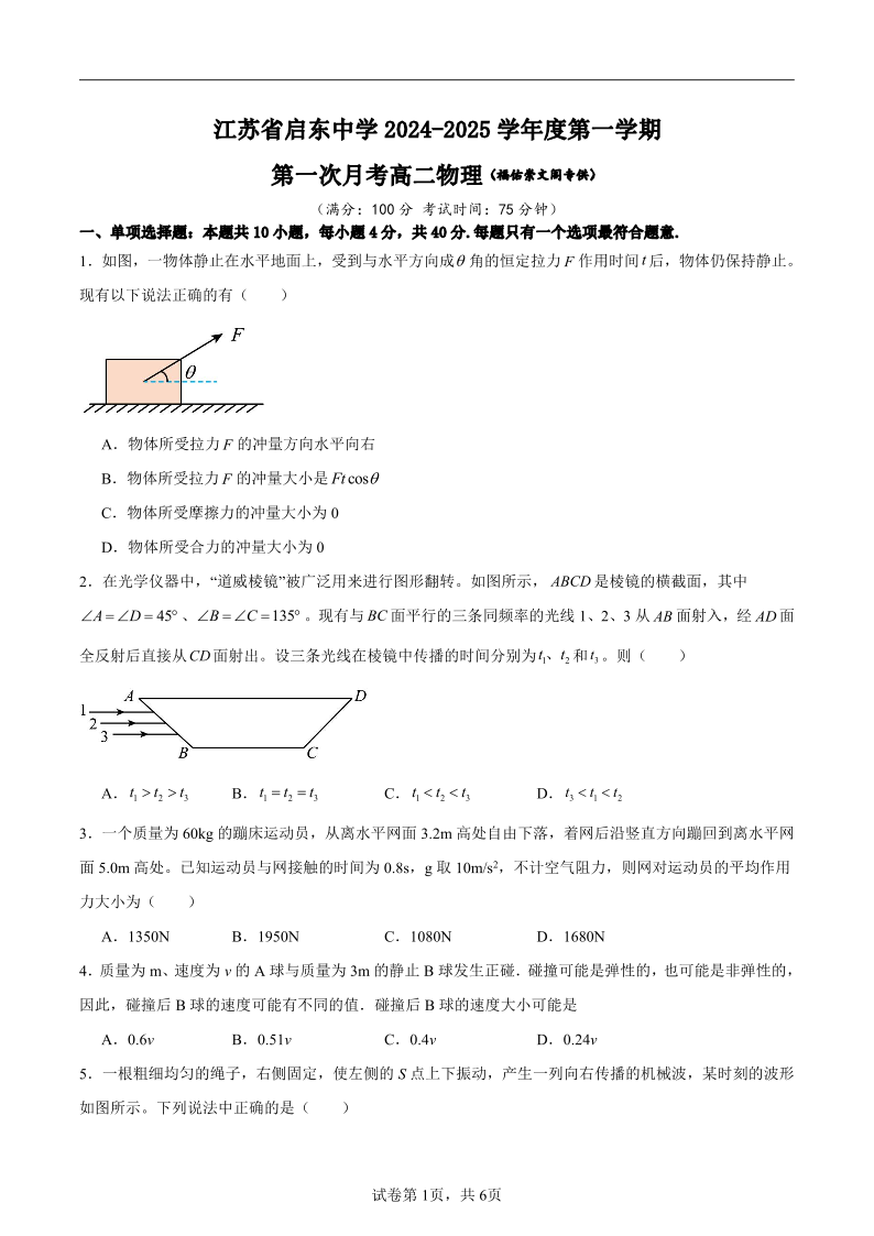 江苏省启东中学2024-2025学年高二上学期第一次月考试题 物理