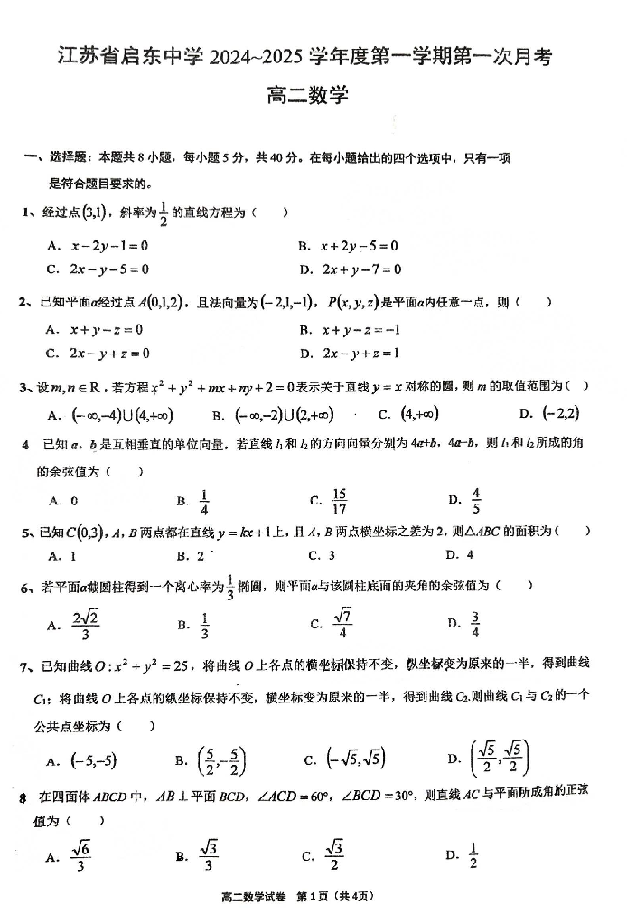 江苏省启东中学2024-2025学年高二上学期第一次月考试题 数学