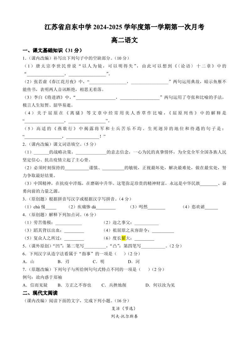 江苏省启东中学2024-2025学年高二上学期第一次月考试题 语文