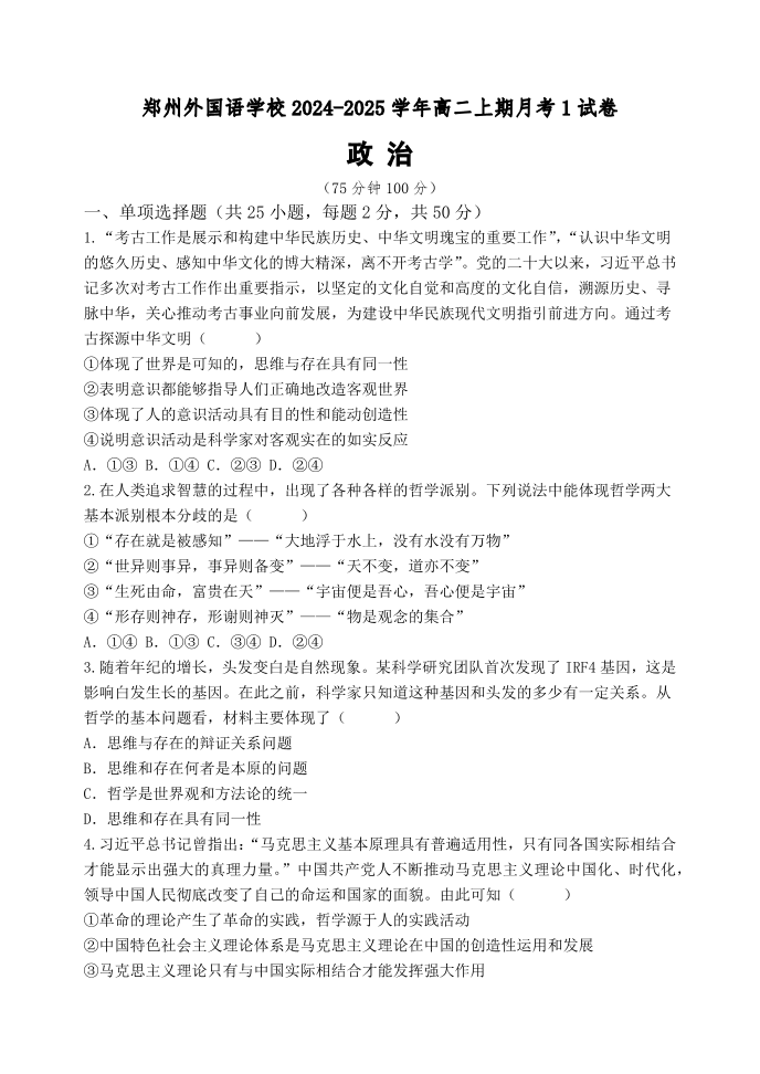 河南省郑州外国语学校2024-2025学年高二上学期10月月考试题 政治