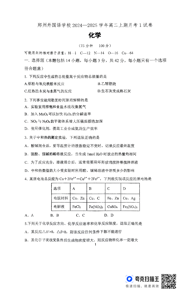 河南省郑州外国语学校2024-2025学年高二上学期10月月考试题 化学