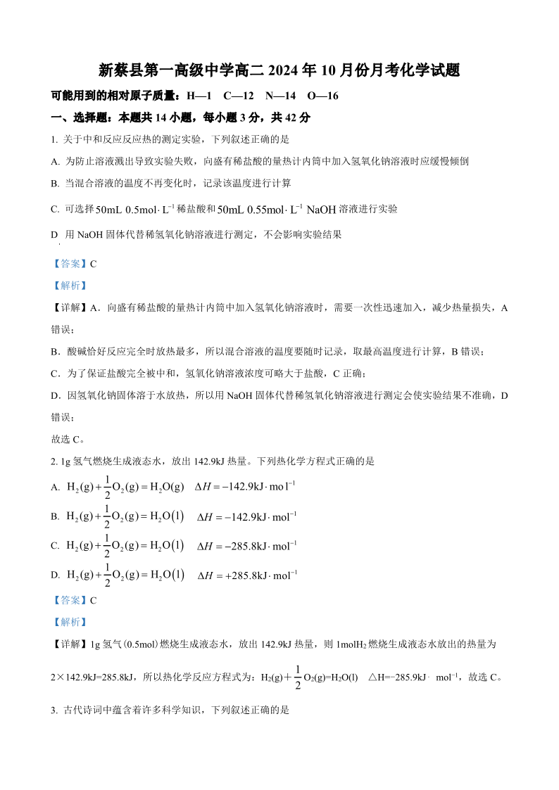 新蔡县第一高级中学高二2024年10月份月考 化学答案