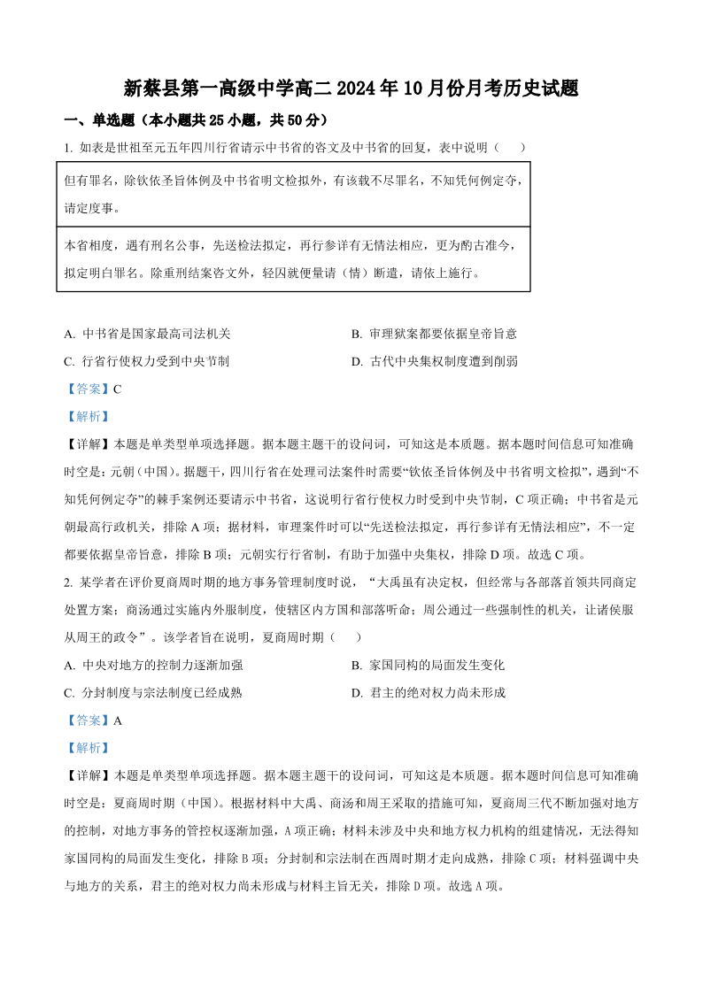 新蔡县第一高级中学高二2024年10月份月考 历史答案