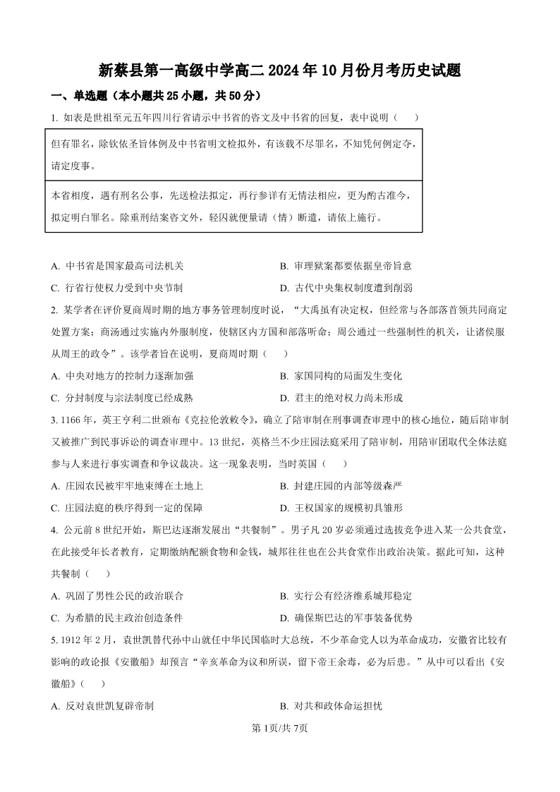 新蔡县第一高级中学高二2024年10月份月考 历史