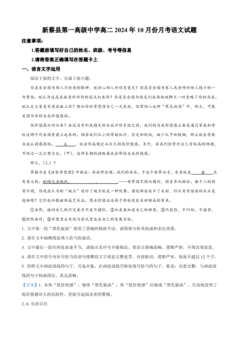 新蔡县第一高级中学高二2024年10月份月考 语文答案