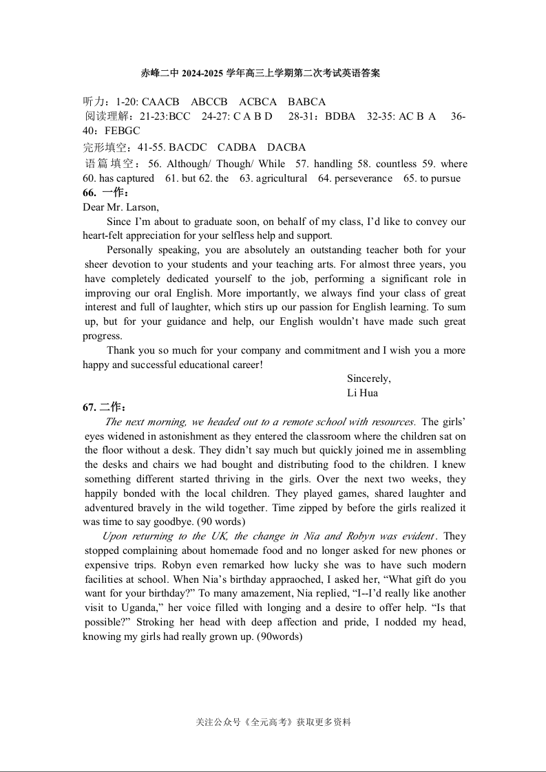 内蒙古赤峰二中2024-2025学年高三上学期第二次月考 英语答案