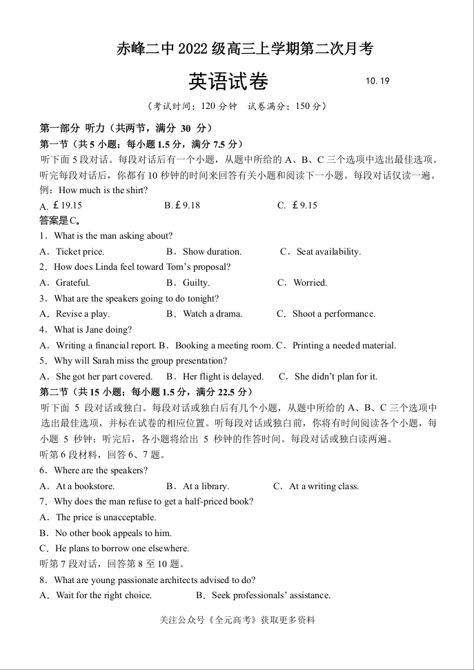 内蒙古赤峰二中2024-2025学年高三上学期第二次月考 英语
