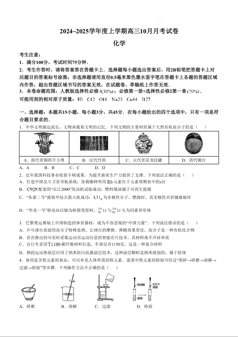 黑龙江省绥化市绥棱县第一中学2024-2025学年高三上学期10月月考 化学