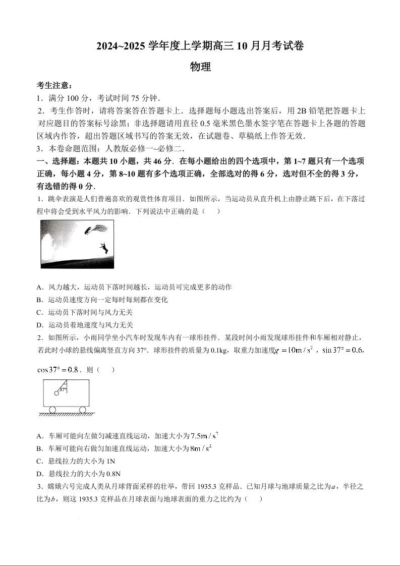 黑龙江省绥化市绥棱县第一中学2024-2025学年高三上学期10月月考 物理