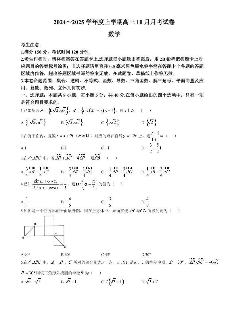 黑龙江省绥化市绥棱县第一中学2024-2025学年高三上学期10月月考 数学