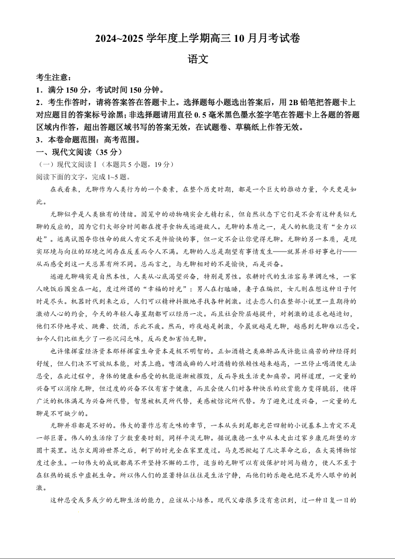 黑龙江省绥化市绥棱县第一中学2024-2025学年高三上学期10月月考 语文