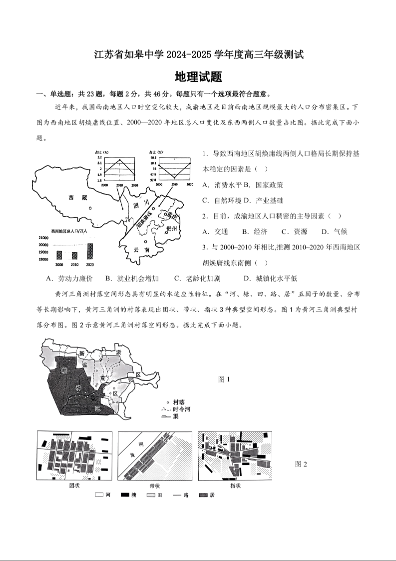 江苏省如皋中学2024-2025学年高三上学期综合练习(一) 地理