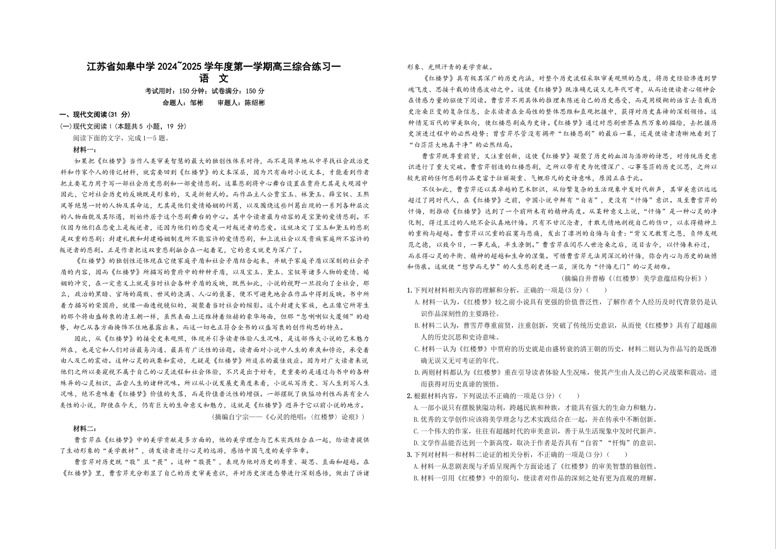 江苏省如皋中学2024-2025学年高三上学期综合练习(一) 语文