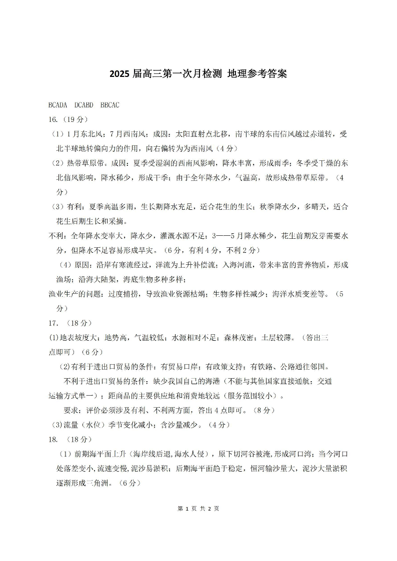 天津市南开中学2025届高三上学期第一次月考 地理答案
