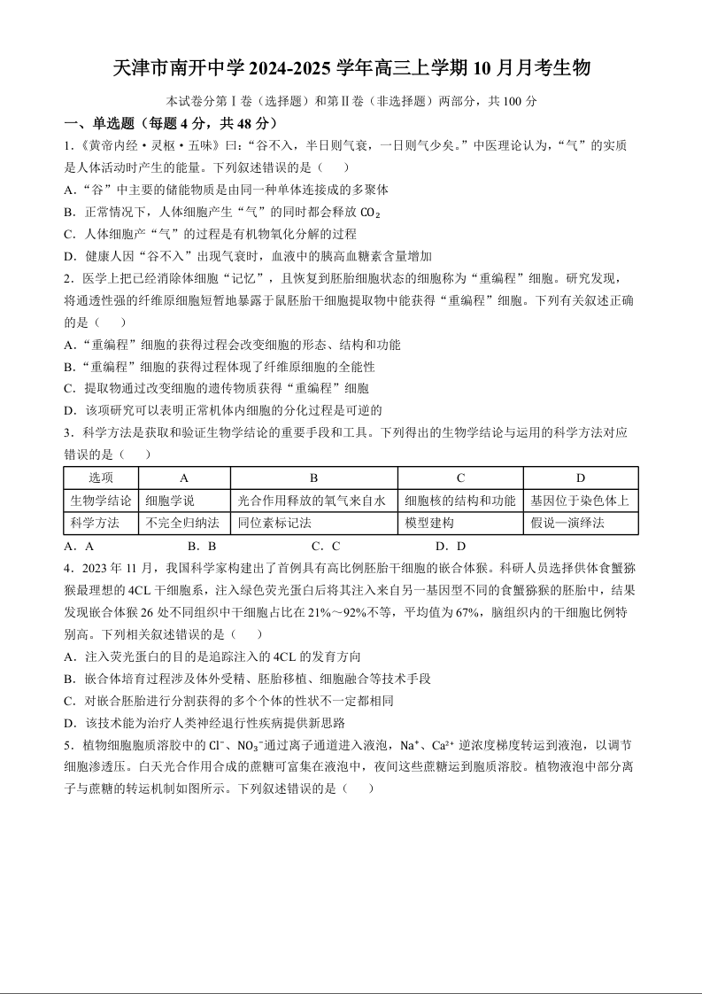 天津市南开中学2025届高三上学期第一次月考 生物