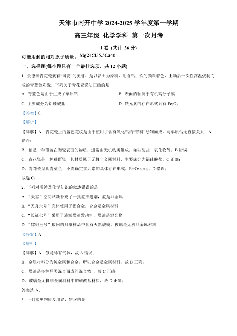 天津市南开中学2025届高三上学期第一次月考 化学答案