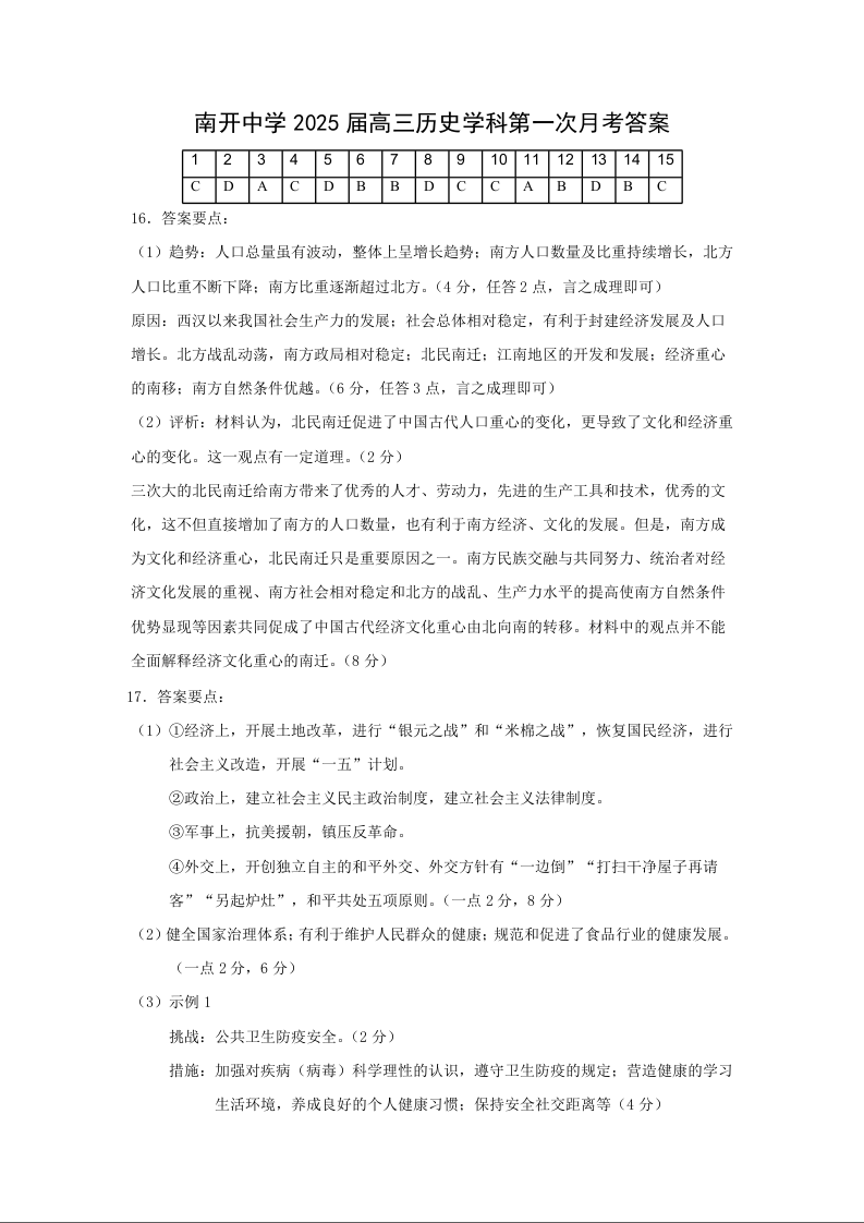 天津市南开中学2025届高三上学期第一次月考 历史答案
