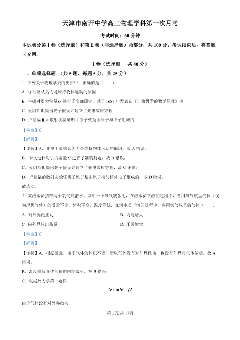 天津市南开中学2025届高三上学期第一次月考 物理答案