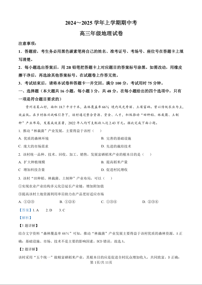 大理白族自治州宾川县高平第一完全中学2025届高三上学期期中考试 地理答案
