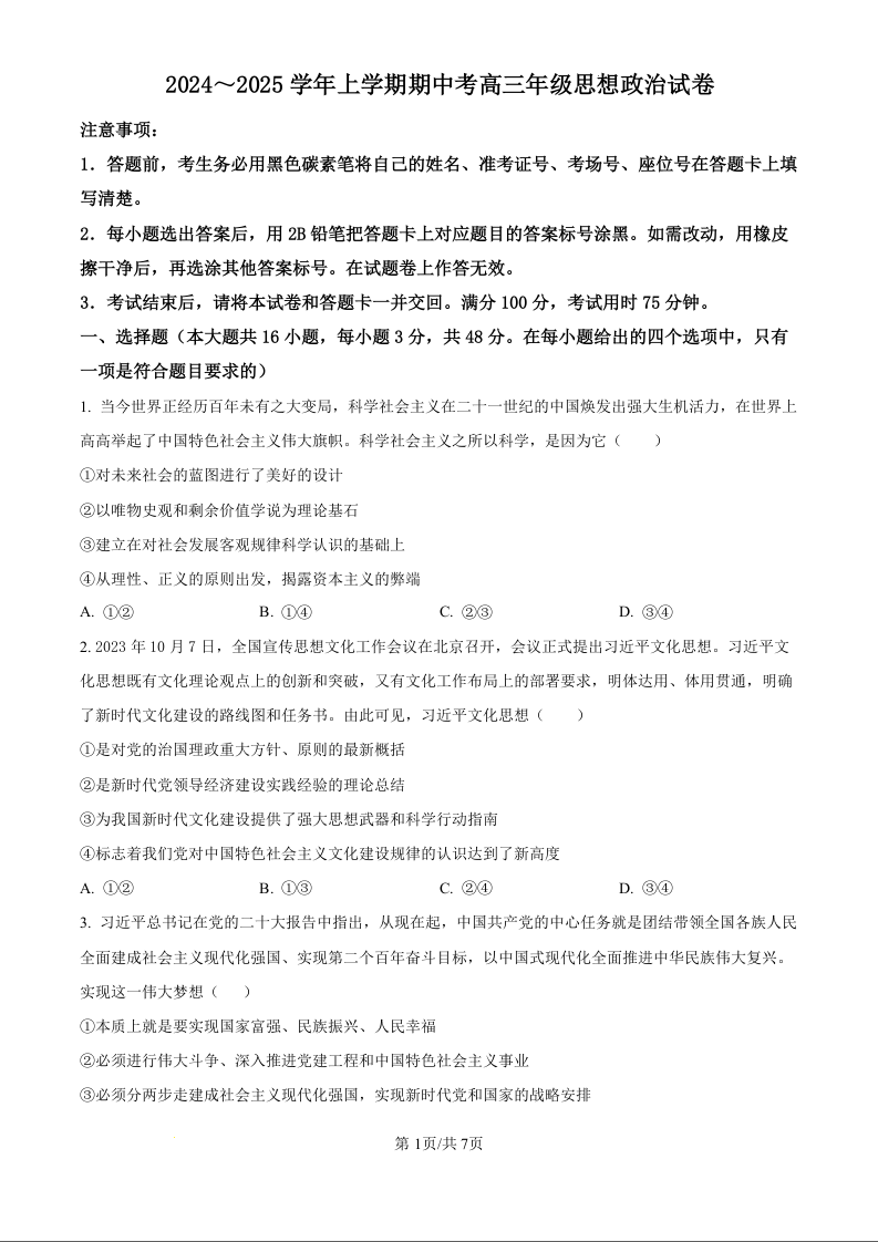 大理白族自治州宾川县高平第一完全中学2025届高三上学期期中考试 政治