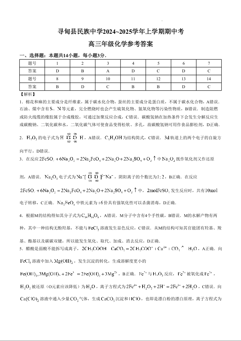 大理白族自治州宾川县高平第一完全中学2025届高三上学期期中考试 化学答案