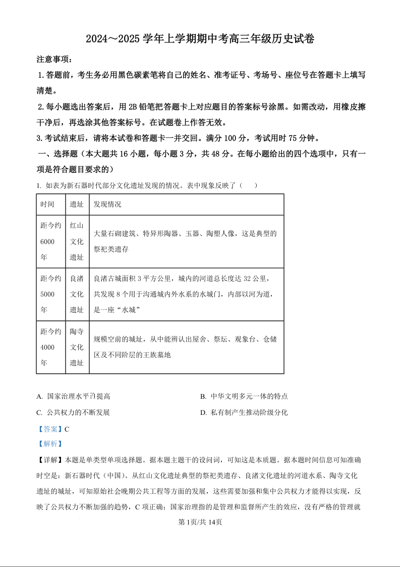 大理白族自治州宾川县高平第一完全中学2025届高三上学期期中考试 历史答案