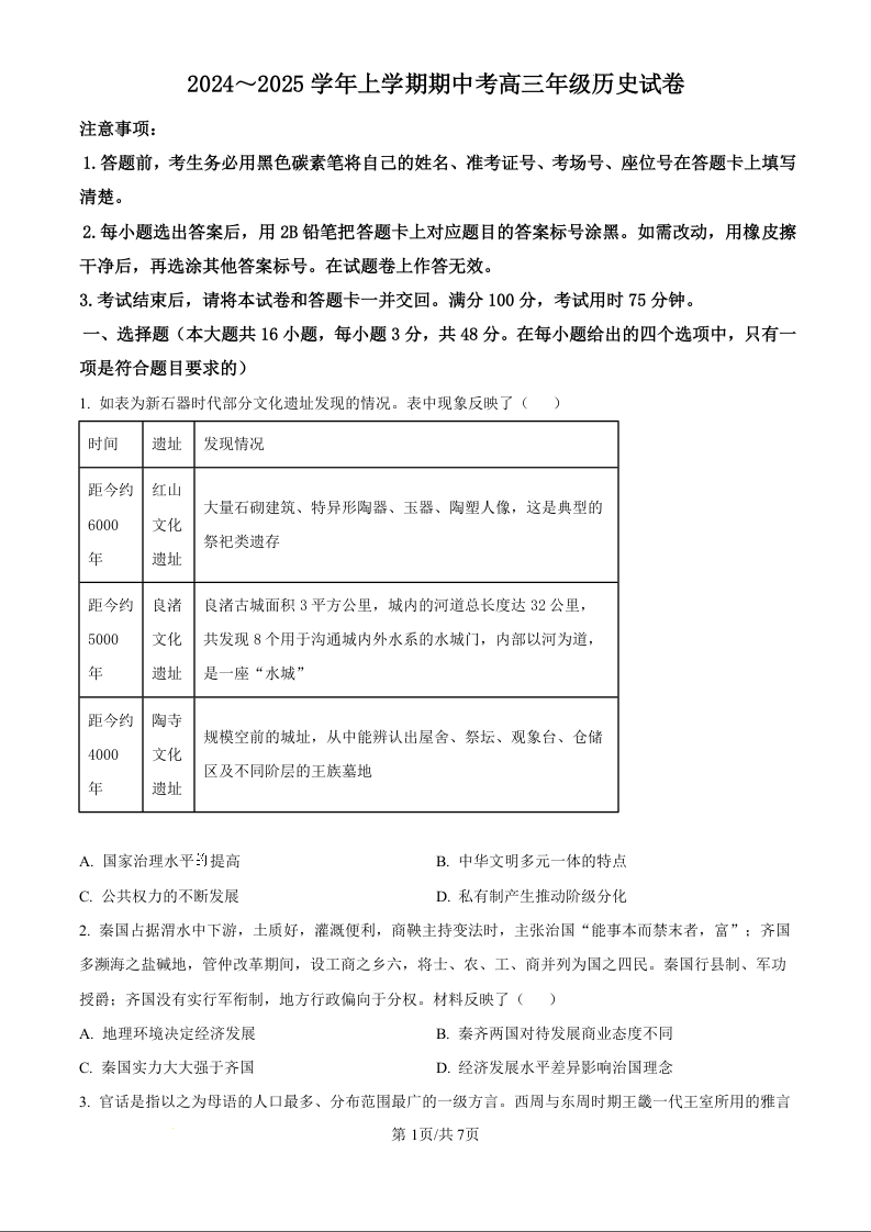 大理白族自治州宾川县高平第一完全中学2025届高三上学期期中考试 历史