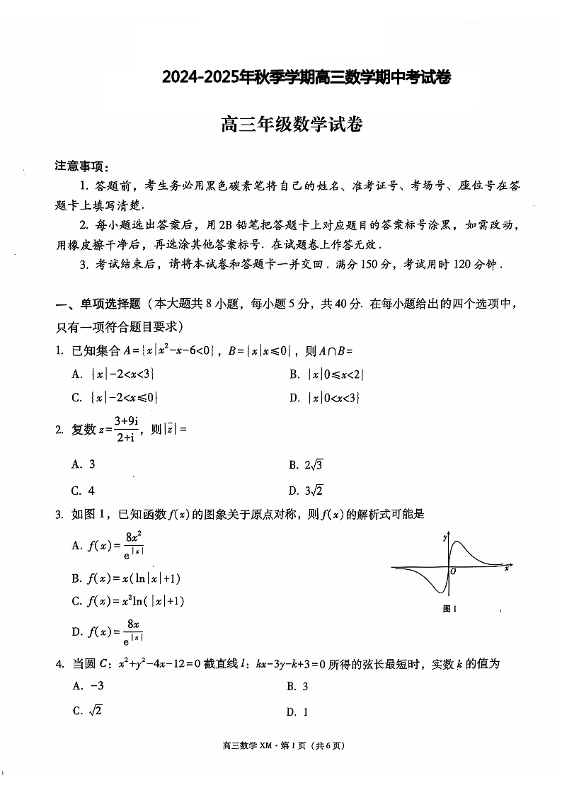 大理白族自治州宾川县高平第一完全中学2025届高三上学期期中考试 数学