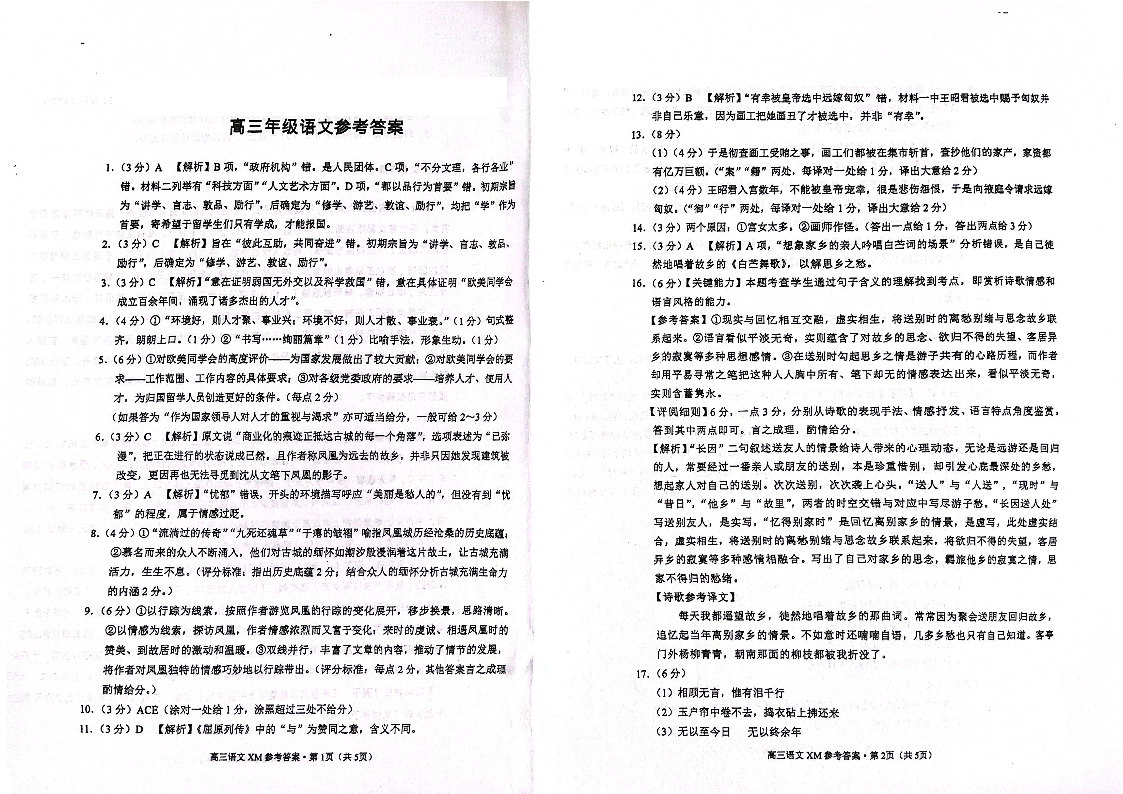 大理白族自治州宾川县高平第一完全中学2025届高三上学期期中考试 语文答案