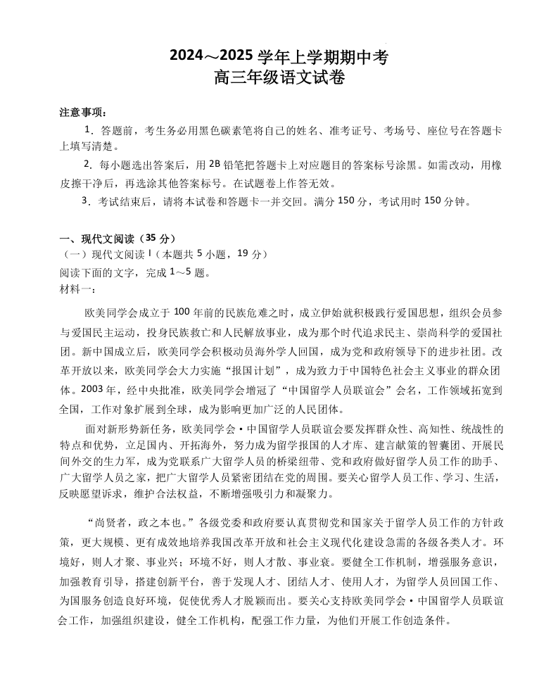 大理白族自治州宾川县高平第一完全中学2025届高三上学期期中考试 语文