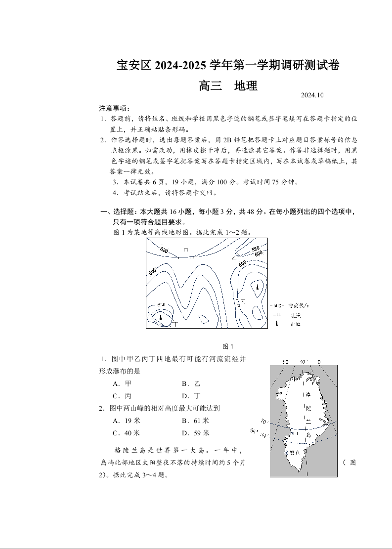 广东省深圳市宝安区2024-2025学年第一学期调研测试卷 地理