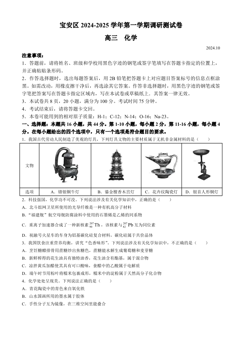广东省深圳市宝安区2024-2025学年第一学期调研测试卷 化学