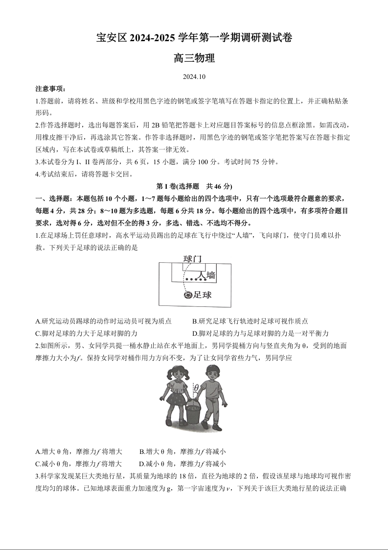 广东省深圳市宝安区2024-2025学年第一学期调研测试卷 物理