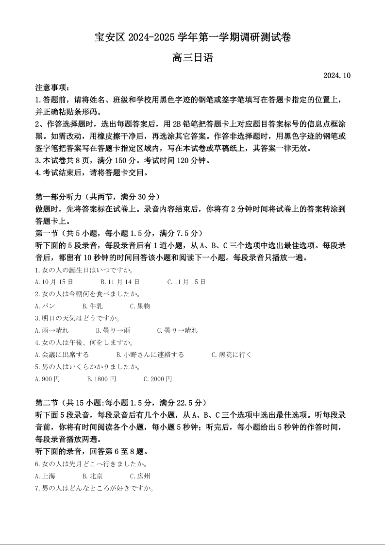 广东省深圳市宝安区2024-2025学年第一学期调研测试卷 日语