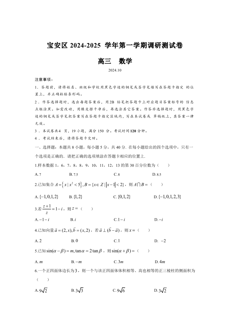 广东省深圳市宝安区2024-2025学年第一学期调研测试卷 数学