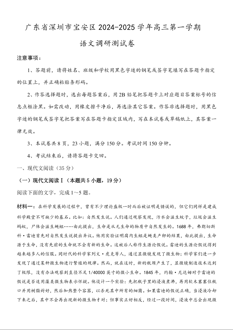 广东省深圳市宝安区2024-2025学年第一学期调研测试卷 语文
