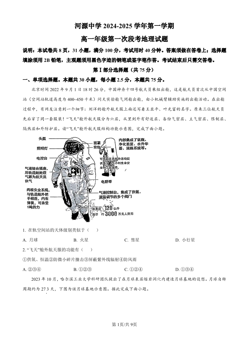 河源中学2024-2025学年第一学期高一年级第一次段考 地理