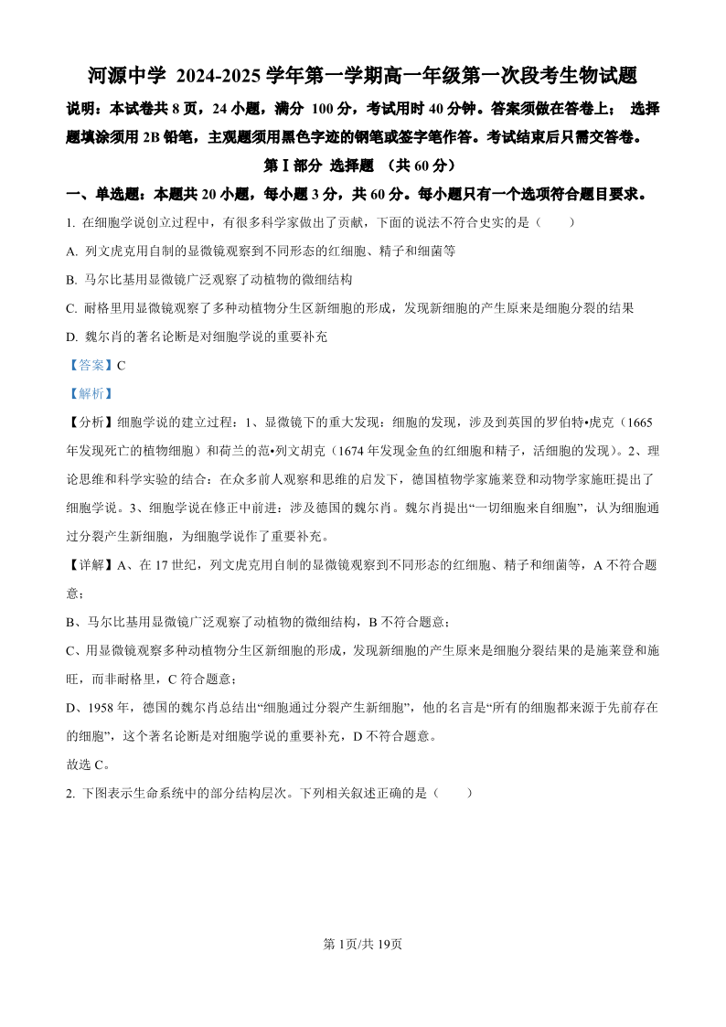 河源中学2024-2025学年第一学期高一年级第一次段考 生物答案